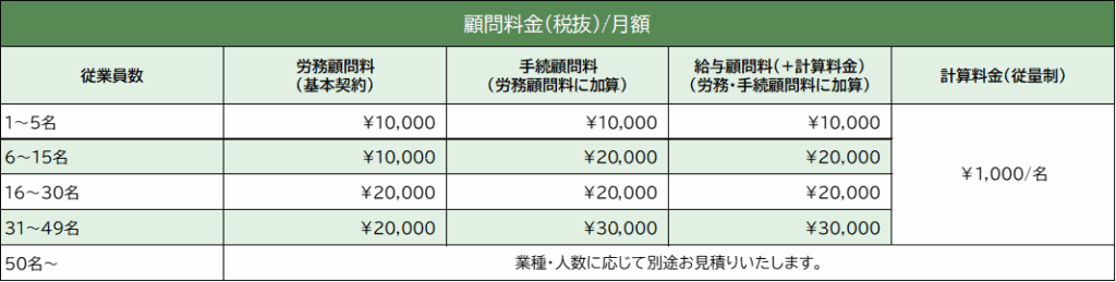 従業員者数および委託業務内容に応じて、以下の通り顧問料金を設定しております。